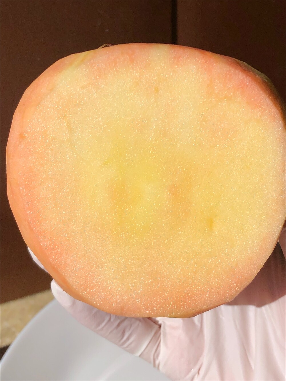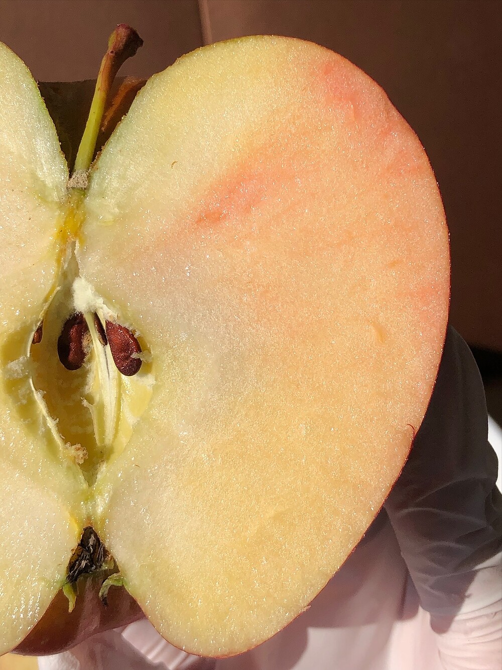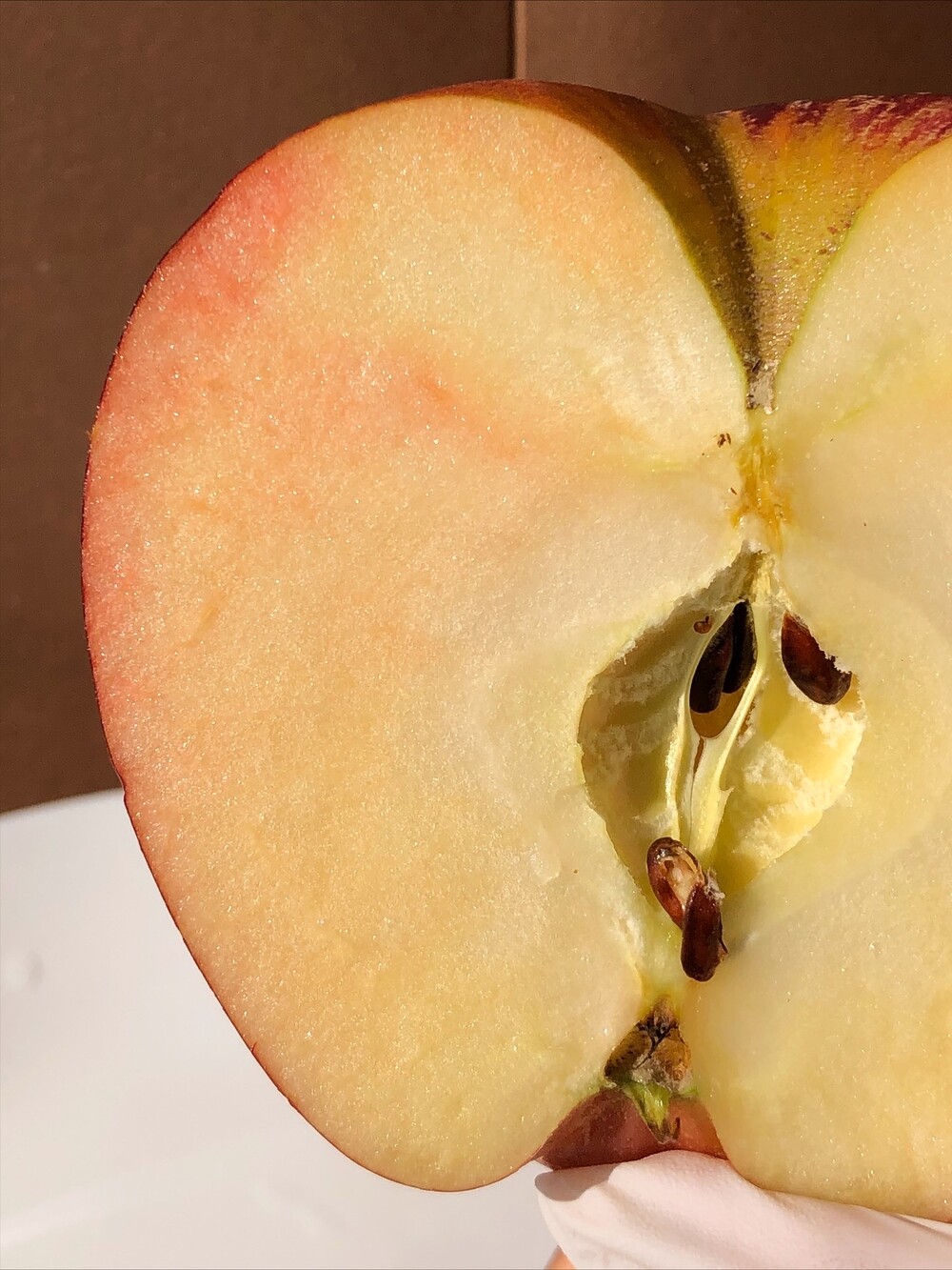 씨앗 주변이 살짝 어둡게 보일 수 있지만, 이는 수분이 풍부한 대과종 엔부사과의 자연스러운 특징이에요. 맛과 신선도에는 전혀 차이가 없습니다.