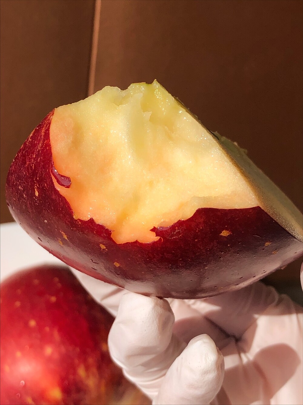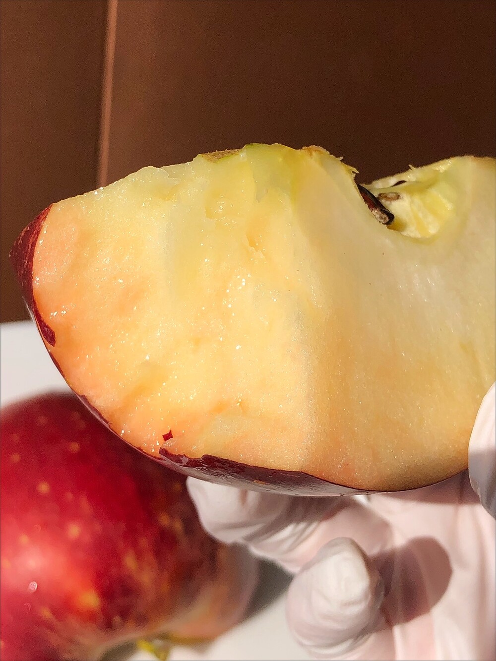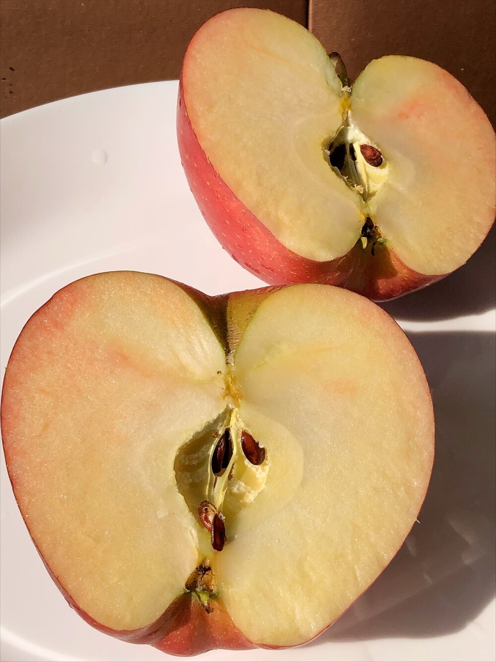 씨앗 주변이 살짝 어둡게 보일 수 있지만, 이는 수분이 풍부한 대과종 엔부사과의 자연스러운 특징이에요. 맛과 신선도에는 전혀 차이가 없습니다.