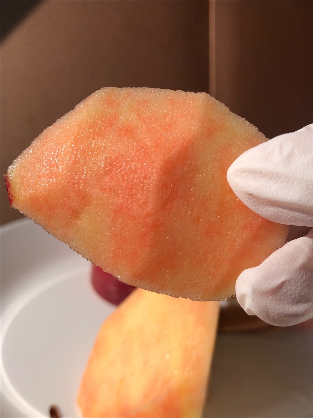 껍질은 새빨갛고 속은 은은한 복숭아빛이라 피치 애플이라고도 해요. 평균 15브릭스 고당도 이상만 선별하여 보여드릴 예정이며 당도와 산미의 황금 비율이 만들어내는 아삭한 식감과 새콤달콤한 균형이 매력적인 최상의 원물들로만 전달해 드릴 예정입니다. 특유의 달콤함과 복숭아향은 그대로 겉은 사과, 속은 복숭아. 상큼한 첫입, 달콤한 마무리로 엔부사과가 전하는 자연 그대로의 달콤한 설렘을 주는 것 같아요. 무작정 달콤하거나 신 사과보다는 이렇게 새콤달콤 아주 쨍하게 균형을 맞추고 있어 너무 맛있습니다. 여기에 사과의 진한 맛, 복숭아의 은은하면서 설렘을 주는 향긋한 맛 전부 아주 짙습니다. 이 모두 짙은 풍미들이 모여 사과가 화려한 맛을 자랑해요.